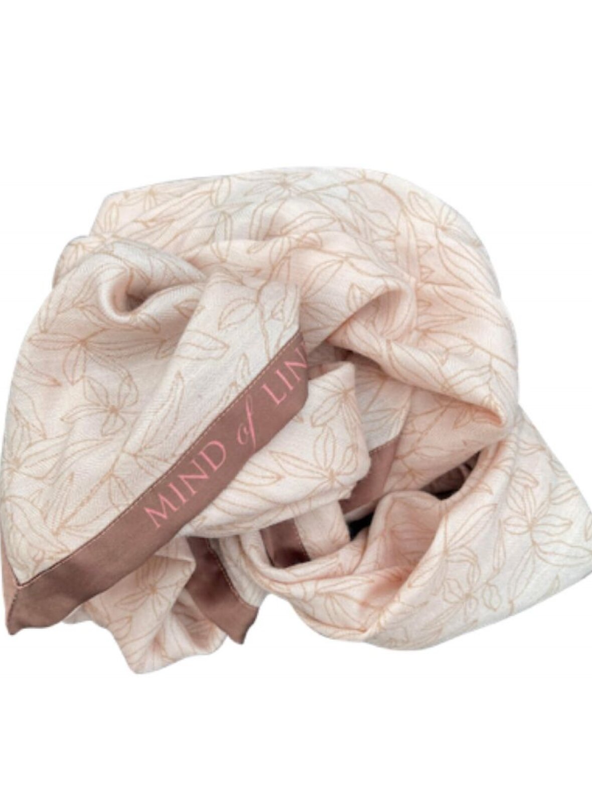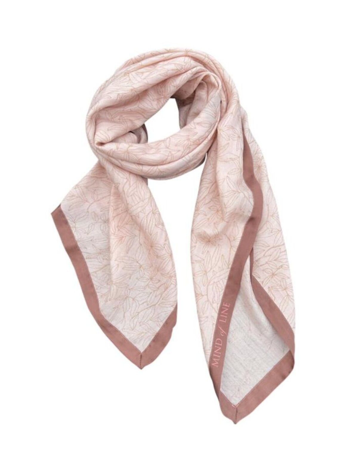 Uldtørklæde fra MIND OF LINE. Tørklædet er lyse lyderøde toner, med et blomstret print.