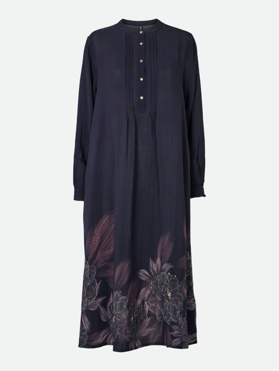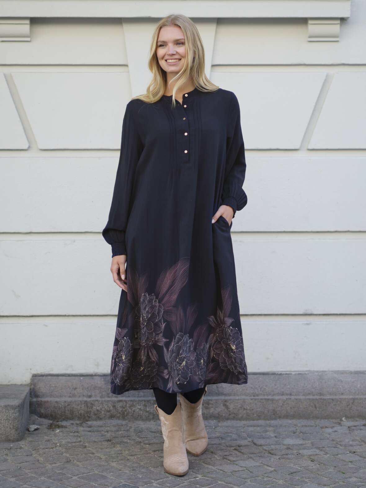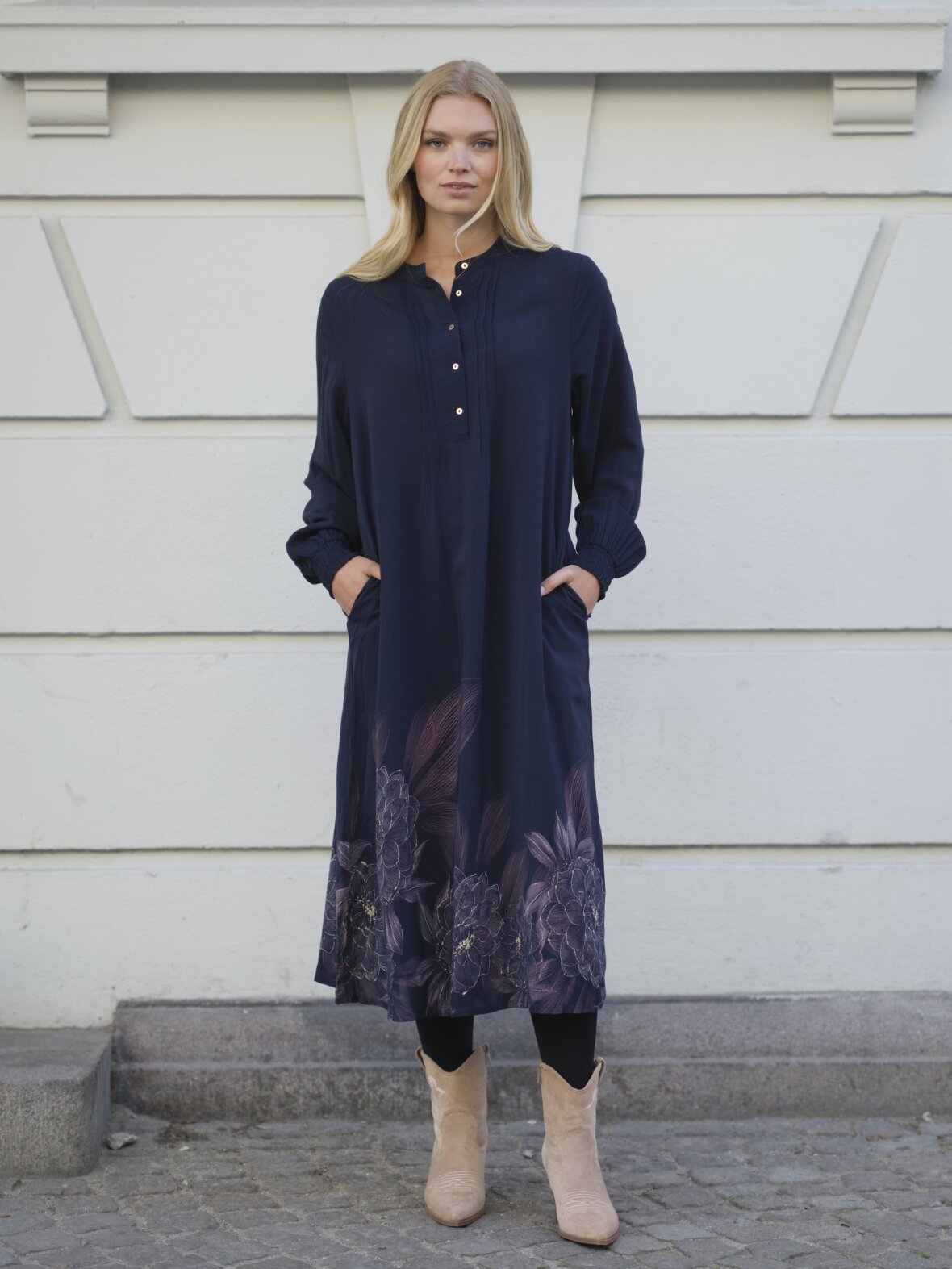 Caroline kjole fra PREPAIR. Kjolen har rund hals, stolpelukning og fine feminine læg ved brystet.Kjolen har lange ærmer med smock ved håndleddet og skjulte lommer i siden.