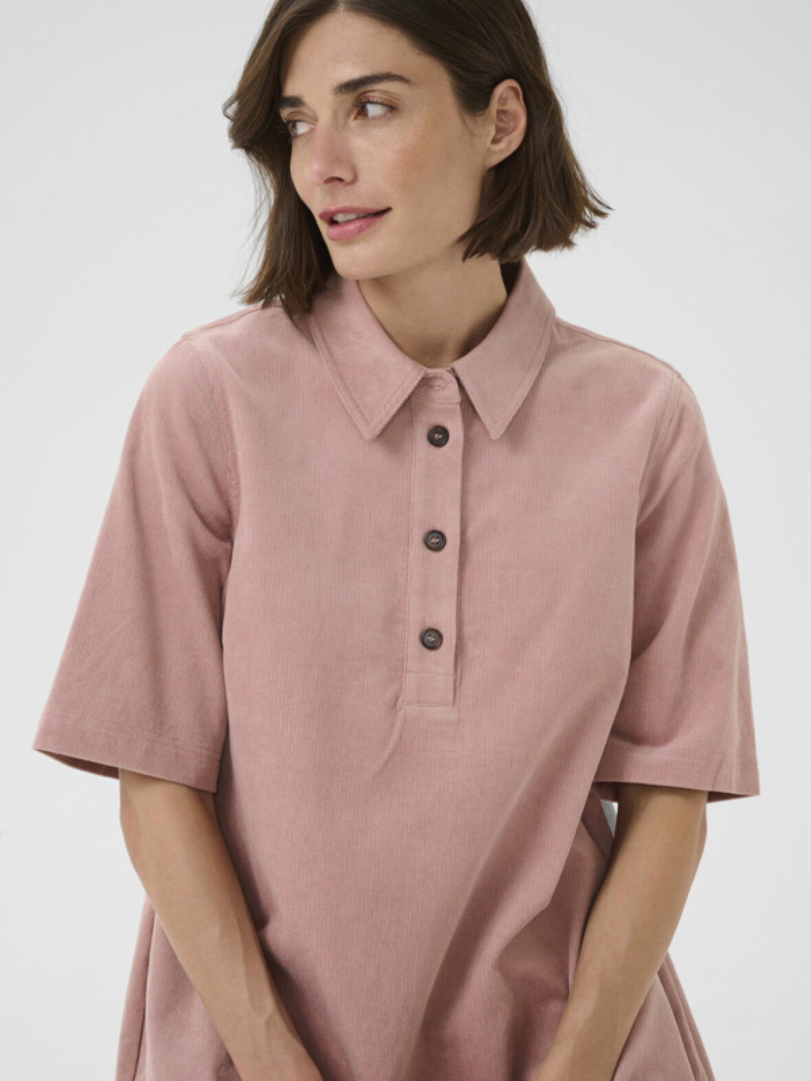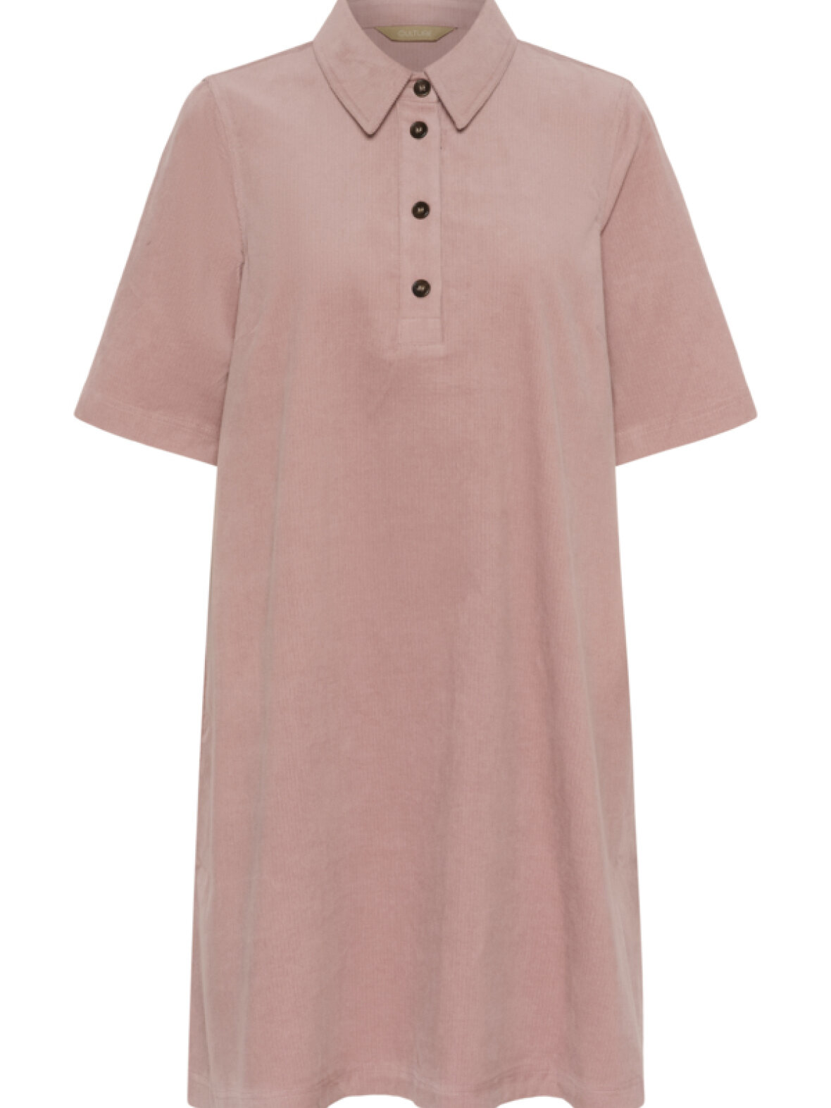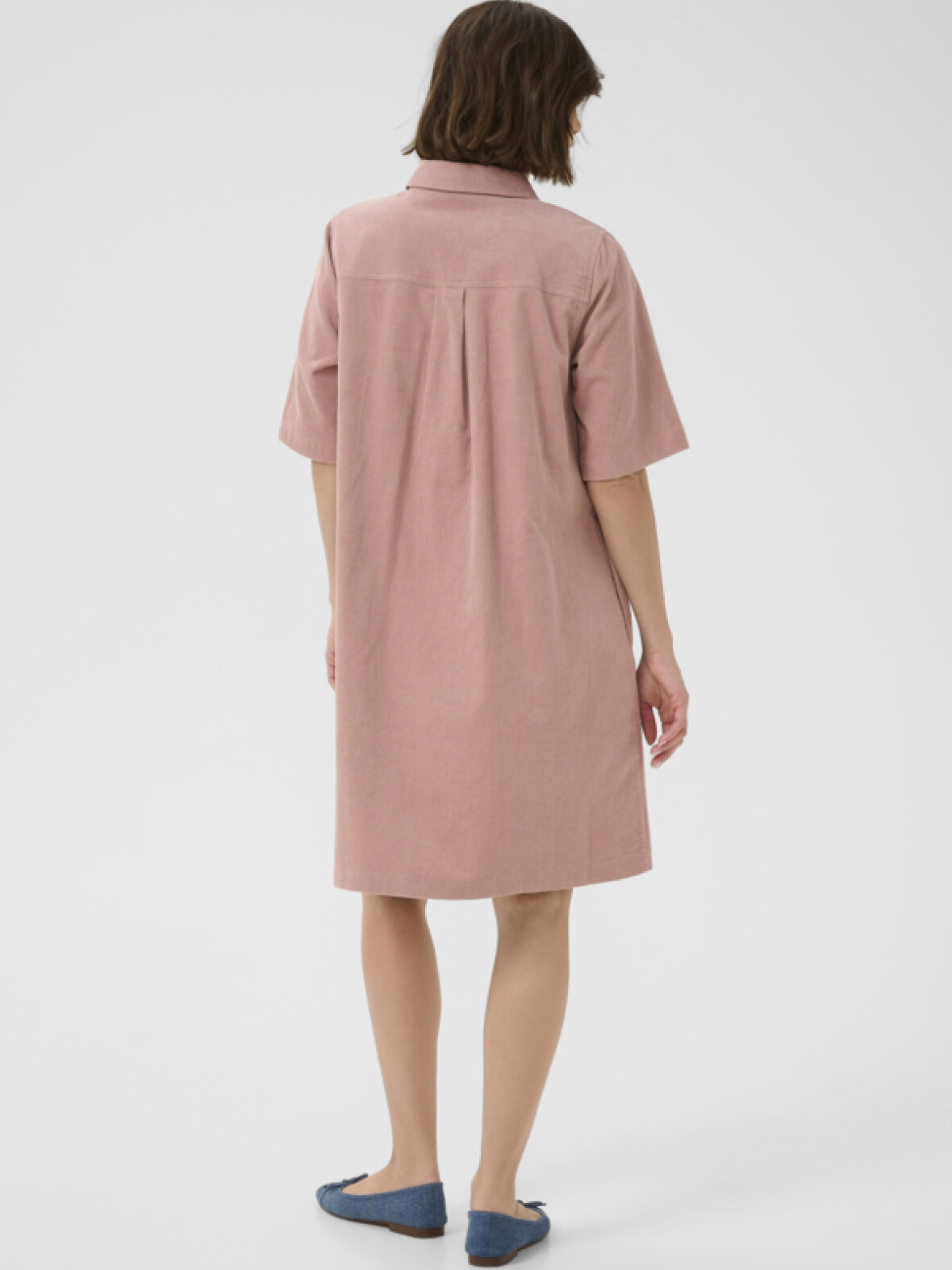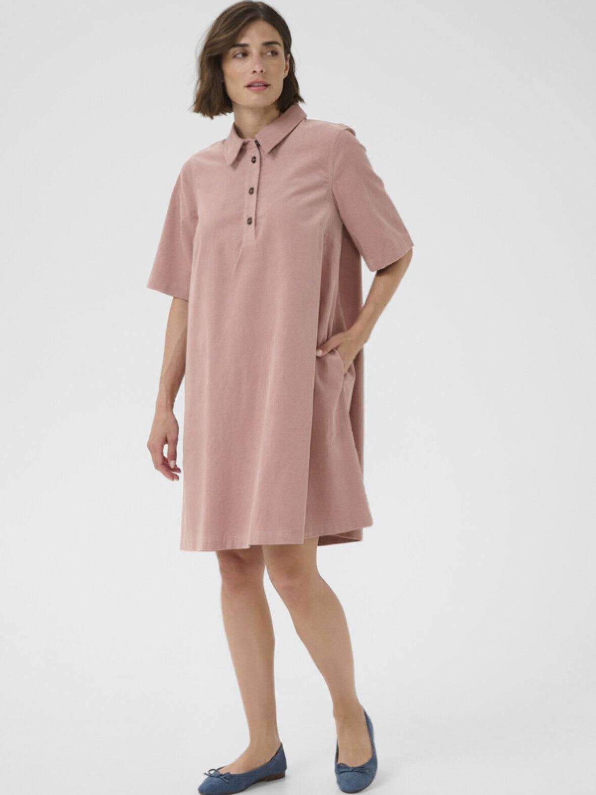 Super fin fløjlskjole med 3/4 lange ærmer, krave, stolpelukning og lommer i siden.