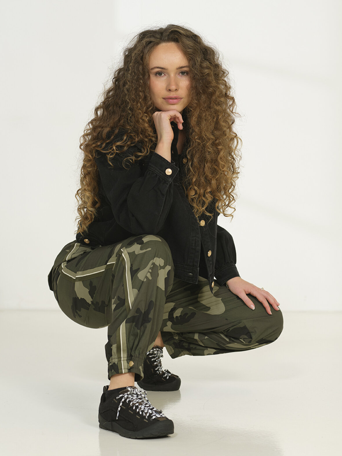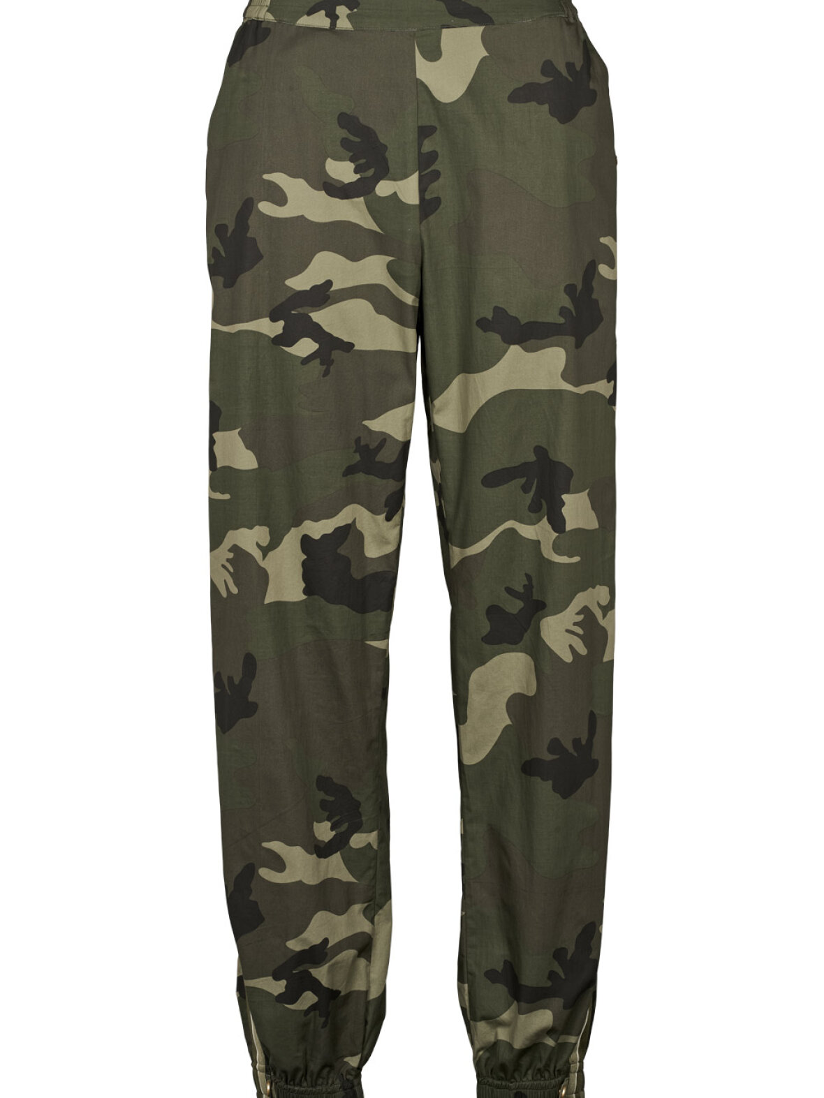 Taylor Pants er casual bukser med et cool camouflageprint i grønne og brune nuancer. Bukserne har elastik i taljen og ved anklerne samt en dekorativ knapdetalje i siden ved anklen. Perfekte til både hverdagsbrug og afslappede dage.