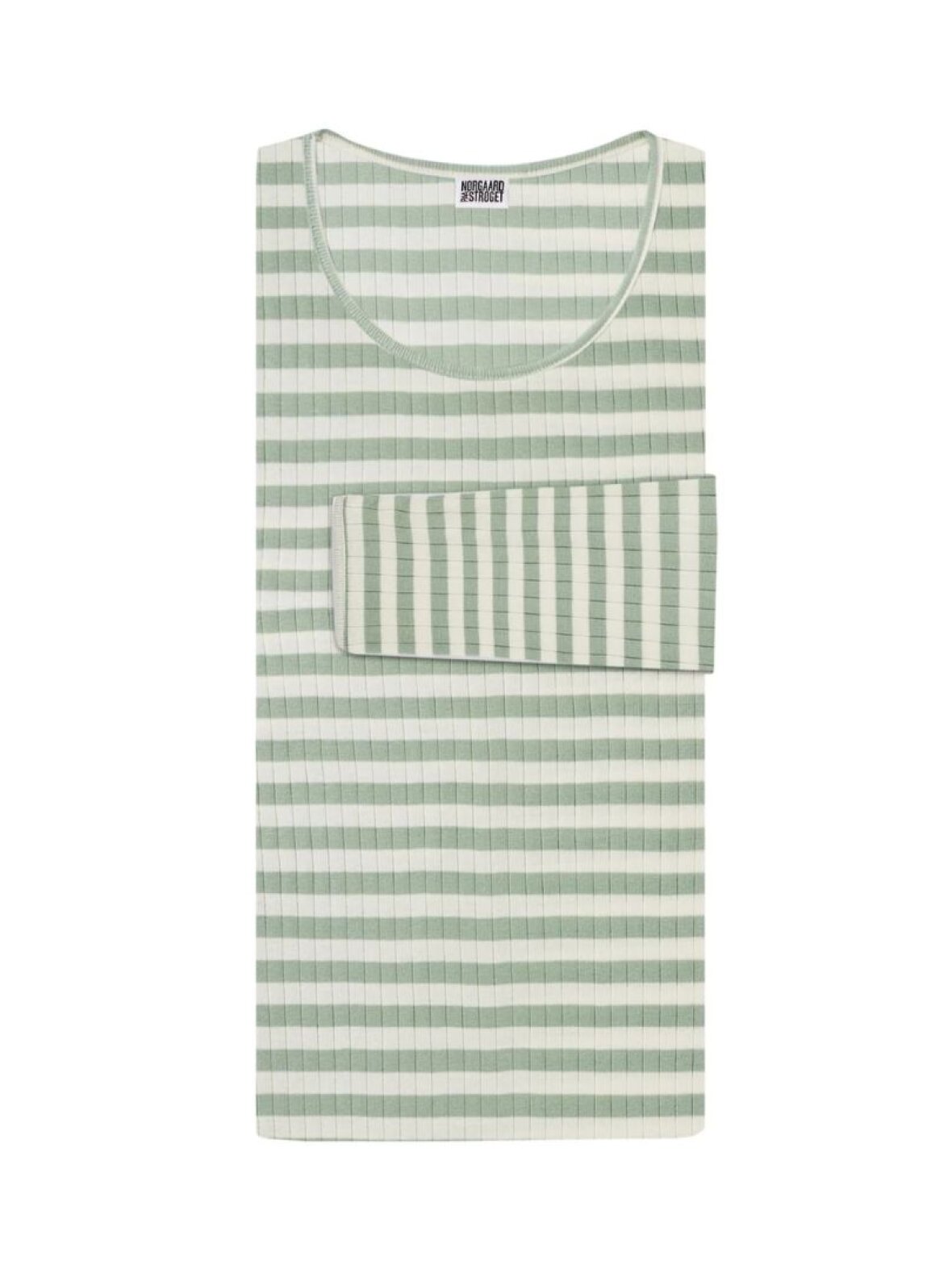 Den populære 101 klassiske basic bluse fra Mads Nørgaard med lange ærmer med grønne og hvide striber. Blusen er One size.
