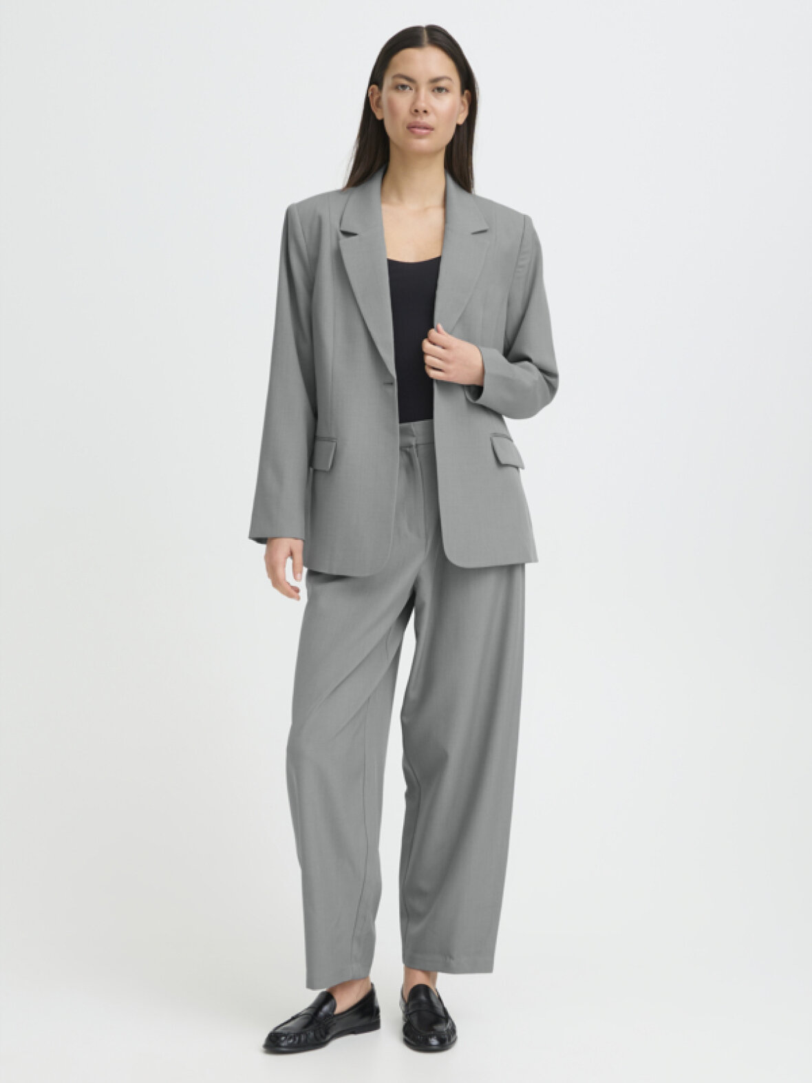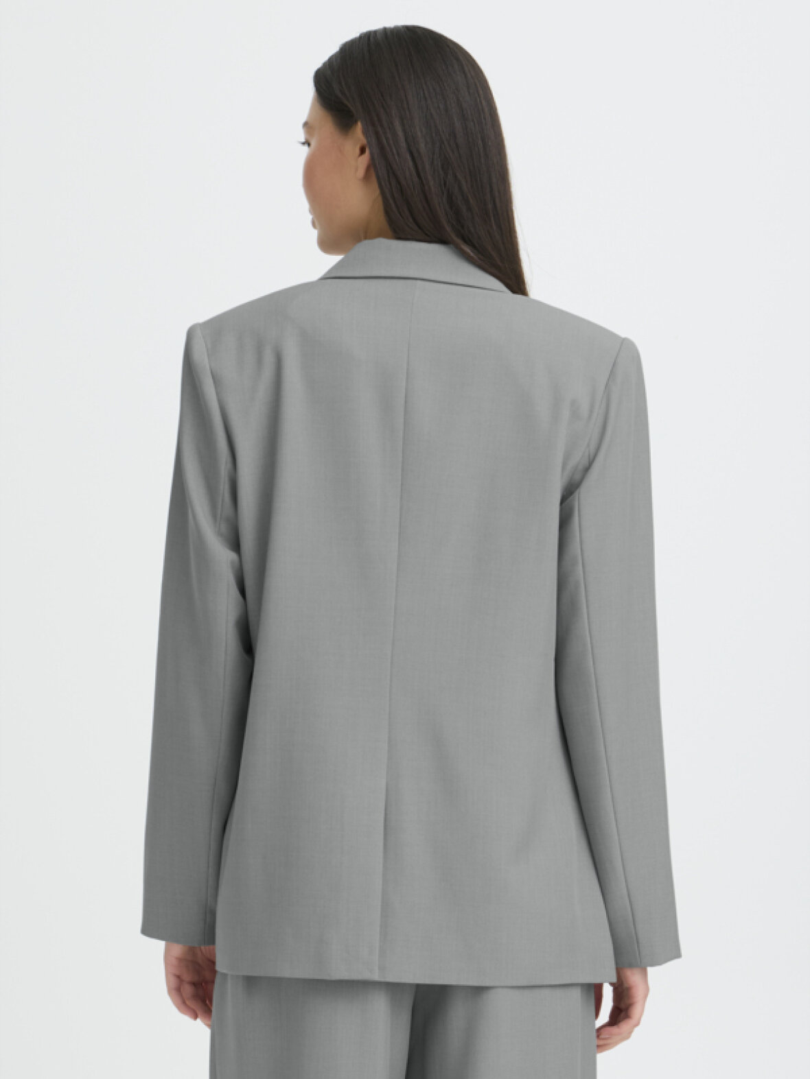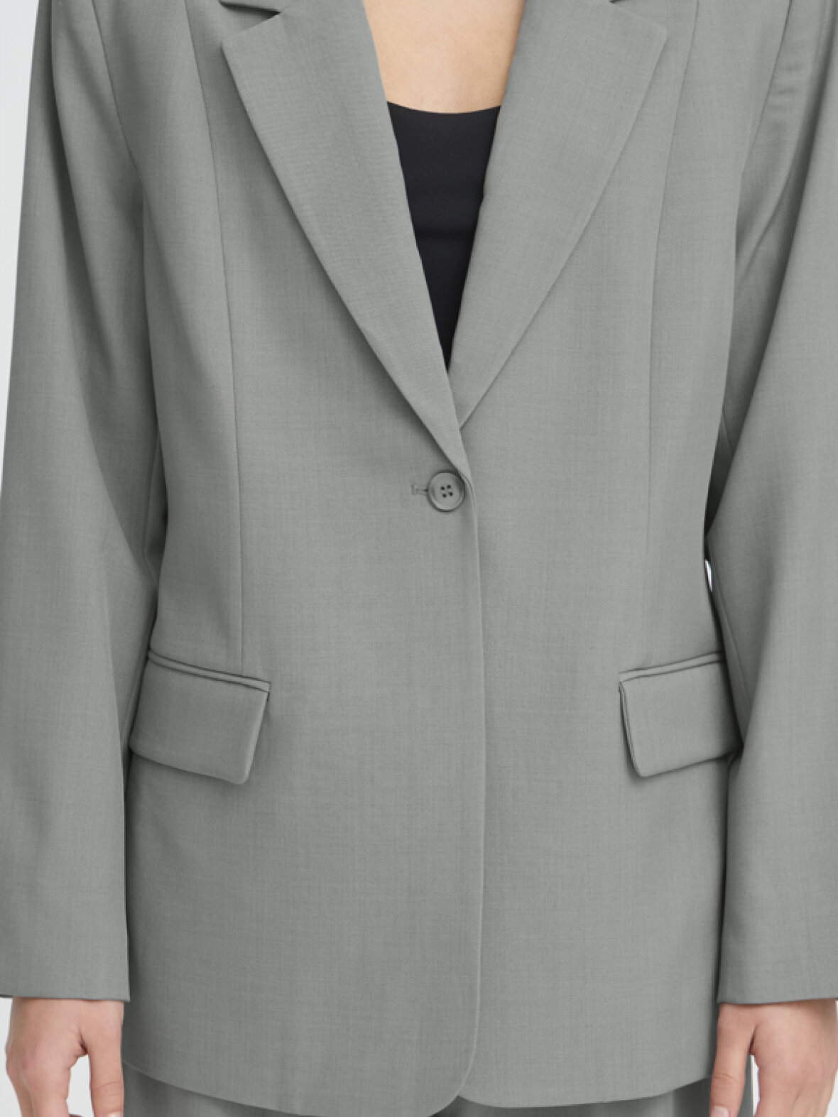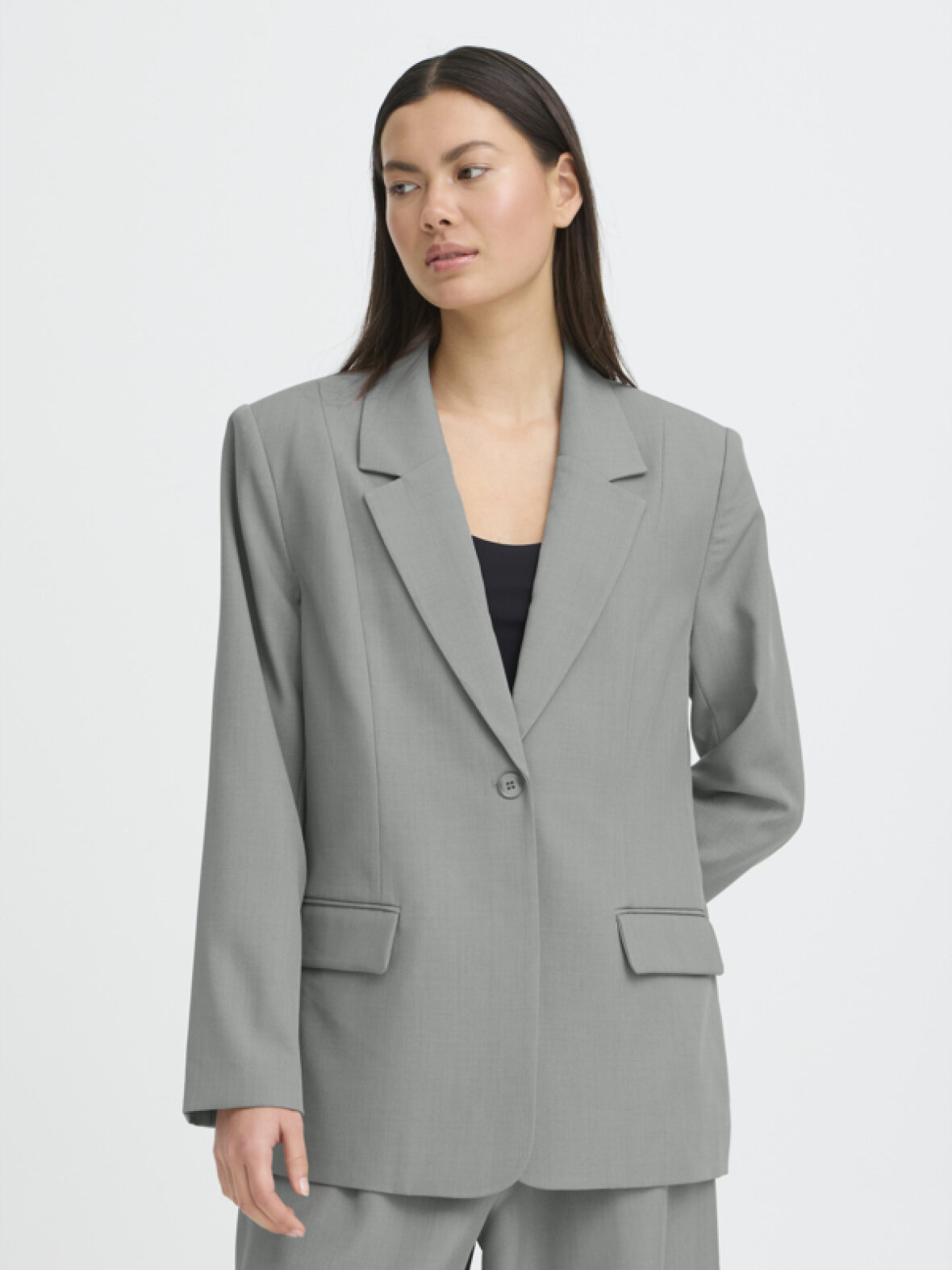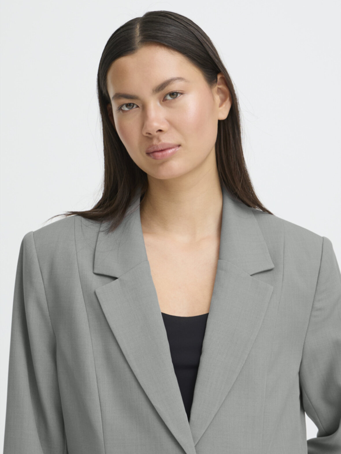 Tidløs blazer fra ICHI, i gråmeleret materiale, med et langt elegant snit. Den har et klassisk udtryk, og passer både til hverdag og fest.