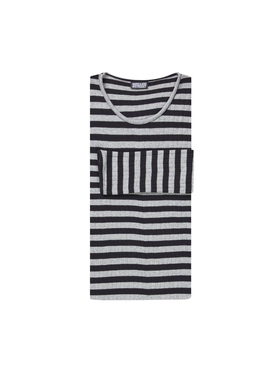 Den populære 101 klassiske basic bluse med mørkeblå og grå striber fra Mads Nørgaard. Blusen er med lange ærmer og One size.
