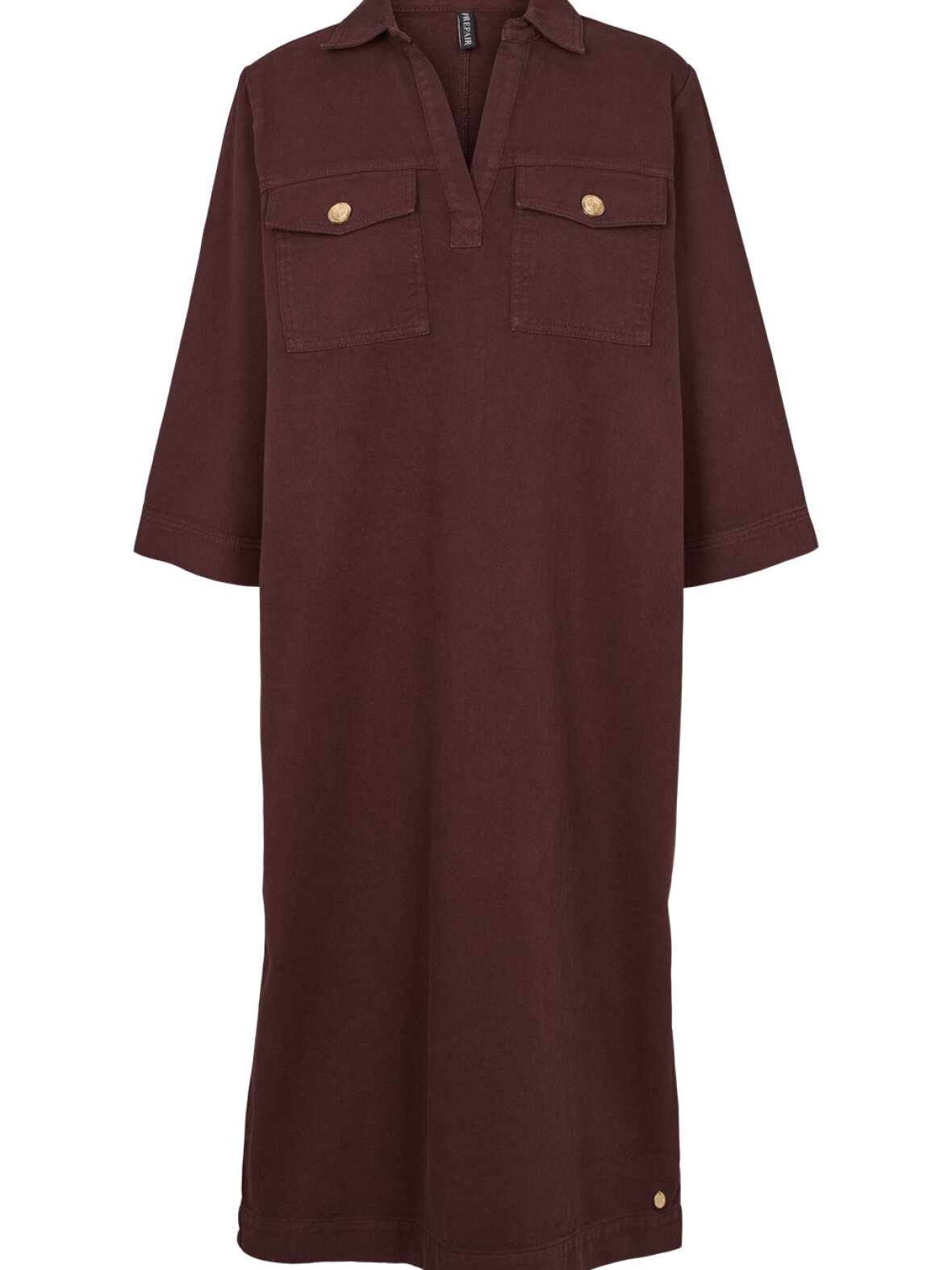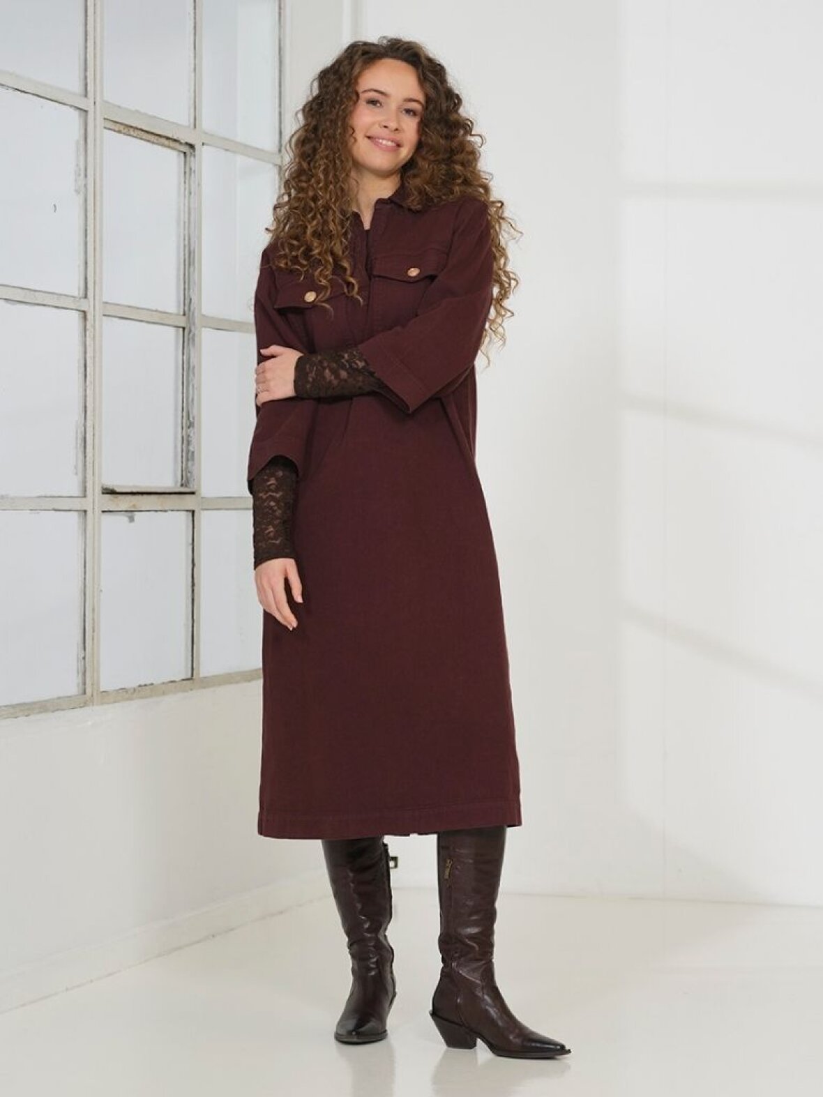 Vivian Dress er en skøn lang denim kjole med løs pasform. Kjolen er med skjortekrave, guldknapper og 3/4 ærmer og har lommer på brystet.