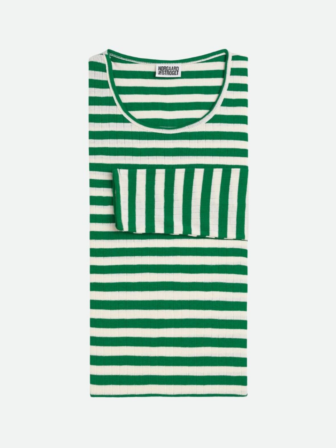Den populære 101 klassiske basic bluse fra Mads Nørgaard med lange ærmer med grønne og hvide striber. Blusen er One size.
