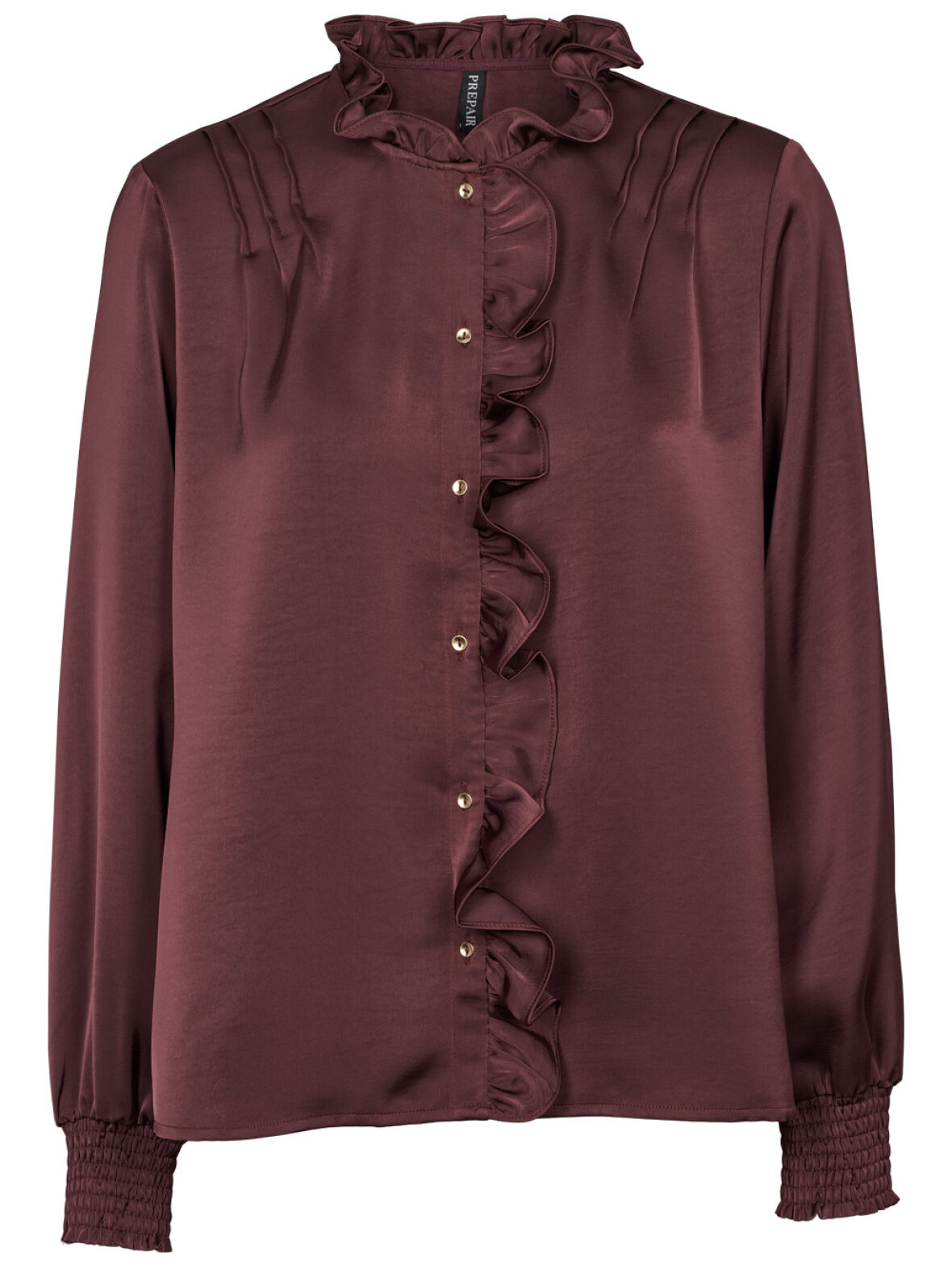 Super fin og feminin skjortebluse. Skjorten har en rund hals med rynket flæsekant langs kraven, tre fine læg på hver skulder og en flæsekant ned langs knappelukningen foran. De lange ærmer afsluttes med bred smock, som giver et let og feminint udtryk.